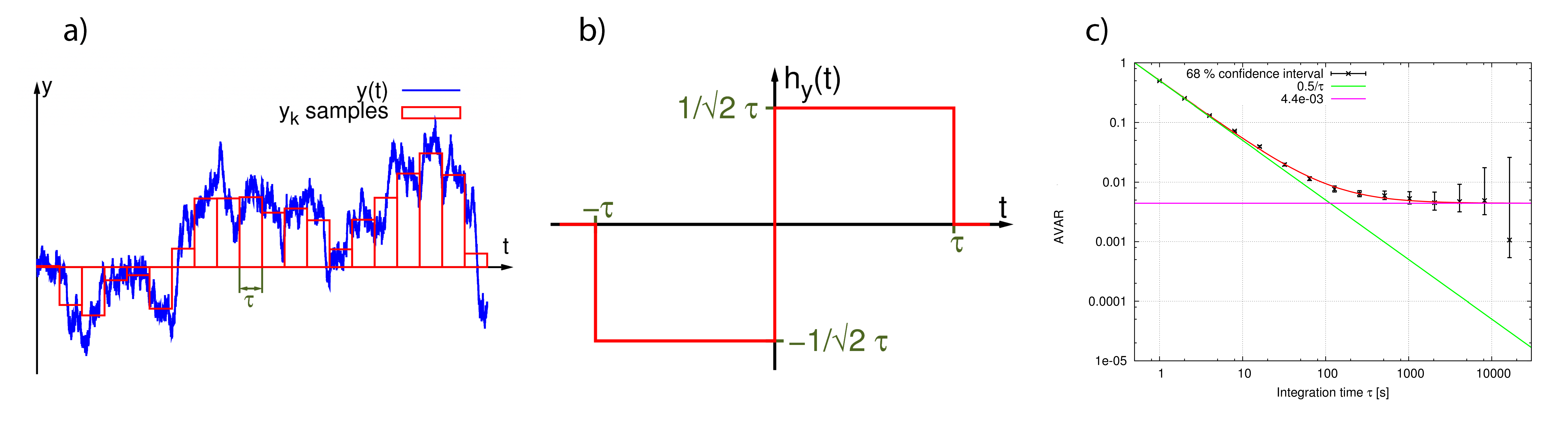 C) Exemple de diagramme AVAR vs temps d’intégration. Le signal analysé (courbe rouge passant au mieux par les barres d’erreur en noir) possède 2 asymptotes. A haute fréquence (petit τ), le signal tend vers une droite de pente 1/2τ caractéristique du bruit blanc, tandis qu’à basse fréquence, le signal tend vers une droite de pente nulle caractéristique d’un bruit de scintillation (« flicker noise »).