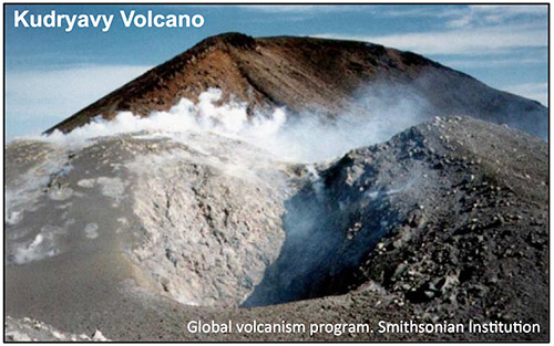 Fig 1. I discovered the analogy between fumarolic incrustations of Kudryavy rocks (here the Kudryavy volcano from Iturup island in the Kurile volcanic arc) and secondary phases of carbonaceous chondrites that inspired this article.