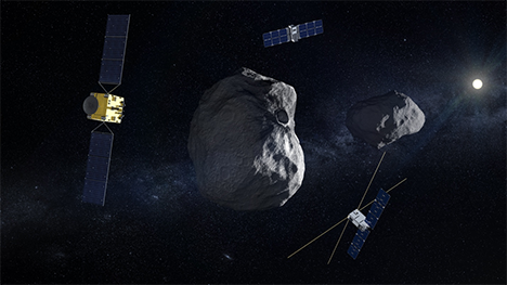 Figure 2 : image de la mission Hera de l’ESA et de ses deux Cubesats, Juventas et Milani, qui partira explorer en 2024 l’astéroïde double Didymos.