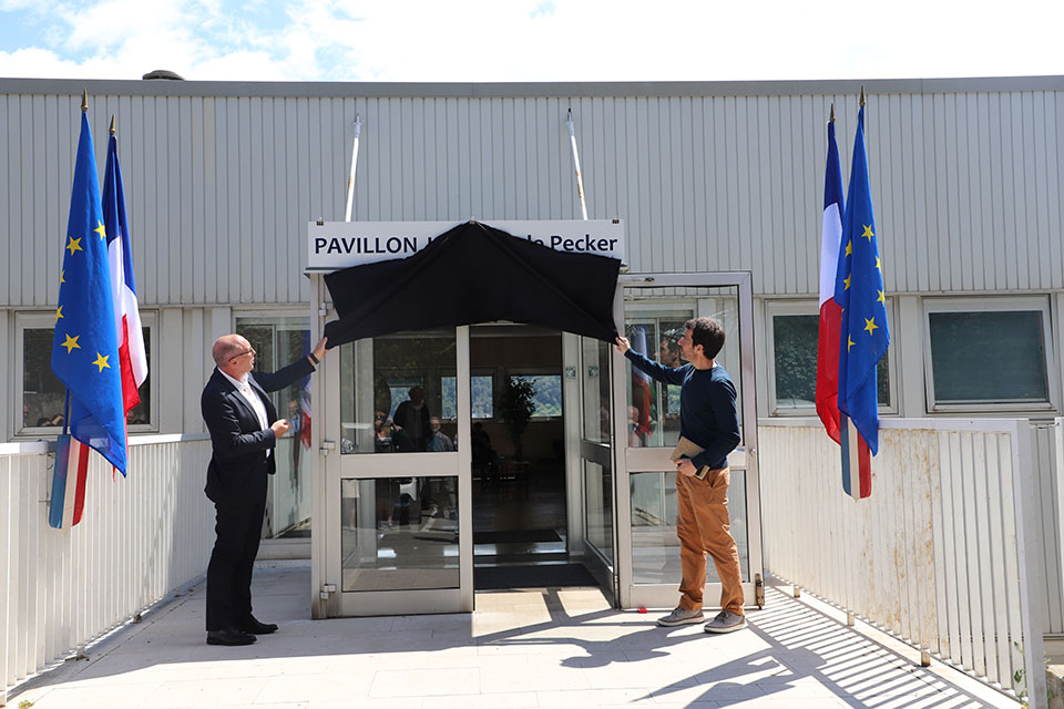 Dévoilement de la nouvelle plaque "Pavillon Jean-Claude Pecker" par Stéphane Mazevet et Lione Bigot.