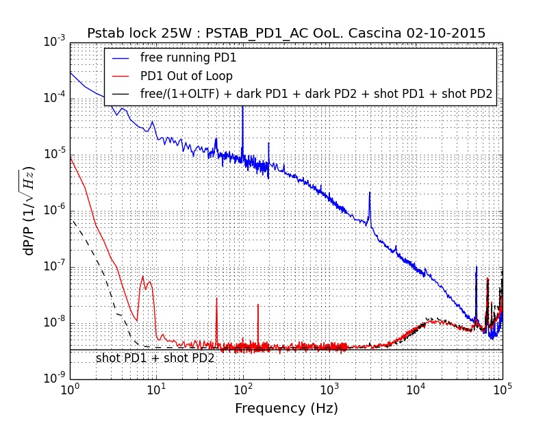 Fig. 3 : Performance of the power stabilization on site (with a power lower than the nominal power). The stabilization is limited by the shot noise between 10 Hz and 4000 Hz reaching 2.5E-9 /Hz^1/2 (out of loop result divided by 2^0.5)