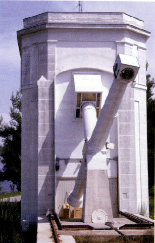 It is a typically French instrument developped by Maurice Loewy. It is not astonishing that Raphaël Bischoffsheim who funded the first coudé equatorial in Paris made another sample in Nice. The usual equatorial required a continual displacement of the observer, to follow the movements of the eyepiece, in incomfortable and tiring positions. Moreover they required the operation of a heavy cupola. Loewy had the idea to apply to this instrument the principle of the "bent refractor" used by the German astronomers for small meridian instruments, that gets rid of these two drawbacks. The optical beam of the refractor is bent at right angle, using a mirror at the top, which forms an angle of 45° with the incidental rays and the reflected rays, and another mirror inclined of 45° in front of the objective. The mirror-objective unit turns around the optical axis and can look successively at all the points of an horary circle. The movement around the polar axis allows to point all the horary circles. The eyepiece remains fixed whatever the direction of the sky is observed . A camera installed at the focus refractor made this coudé equatorial an appropriate instrument to the quest of comets, which was the aim of its installation in Nice. |