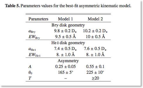 Results. We obtain a disk extension in the Brγ line of 10.2 D⋆ and 7.8 D⋆ in the He I line at 2.05 μm assuming a Gaussian disk model. The disk is clearly following a Keplerian rotation. We obtained an inclination angle of 55°, and the star is a nearly critical rotator with Vrot/Vc = 1.00 ± 0.2. This inclination is greater than the value found for γ Cas (about 42°), and is consistent with the inference from optical Fe II emission profiles that the inclination should be more than the γ Cas value. In the near-IR continuum, the disk of HD 110432 is 3 times larger than γ Cas’s disk. We have no direct evidence of a companion around HD 110432, but it seems that we have a clear signature for disk inhomogeneities as detected for ζ Tau. This asymmetrical disk detection may be interpreted within the one-armed oscillation viscous disk framework. Another finding is that the disk size in the near-IR is similar to other Be stars with different spectral types and thus may be independent of the stellar parameters, as found for classical Be stars.