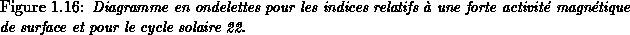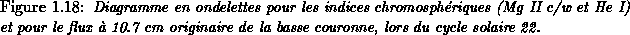 De la même façon que pour le cycle 21, la période de rotation évolue de 30 jours environ à 26 jours, du maximum au minimum du cycle. Il est assez remarquable de constater combien les structures significatives des différents diagrammes se ressemblent dans leur géométrie et leurs localisations temporelle et fréquentielle. Cela tendrait à montrer que ces indicateurs sont tous influencés par le même phénomène physique et que leur réaction vis à vis de ce phénomène est à peu près la même.